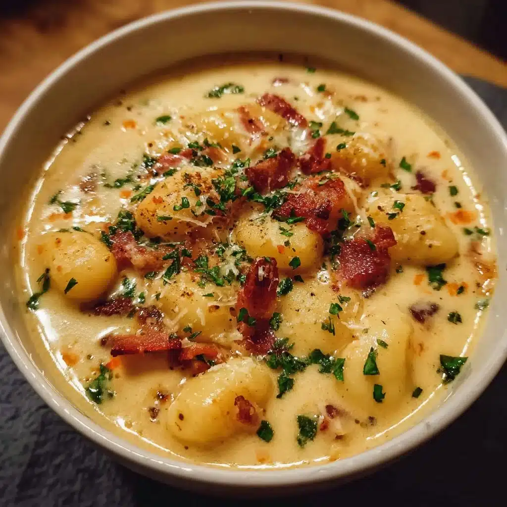 A comforting soup with tender gnocchi, smoky bacon, sharp cheddar cheese, and vibrant vegetables, perfect for cozy weeknights.