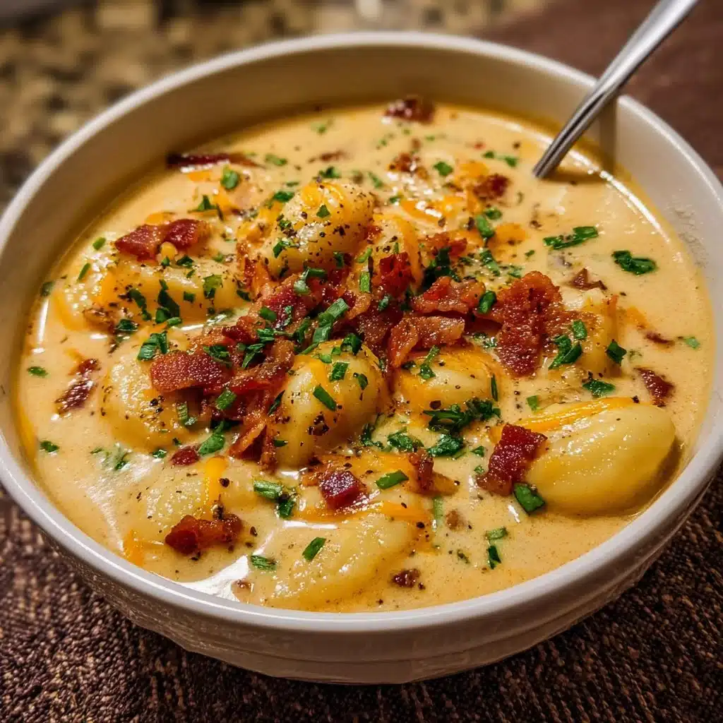 A comforting soup with creamy broth, tender gnocchi, crispy bacon, and rich cheddar cheese, perfect for chilly evenings.