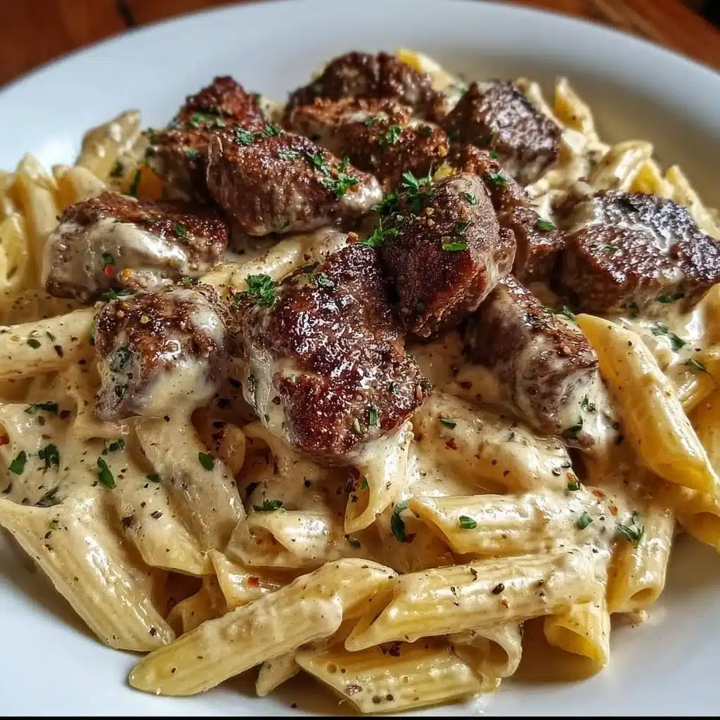 Cajun Steak Tips served with penne in creamy Parmesan cheese sauce