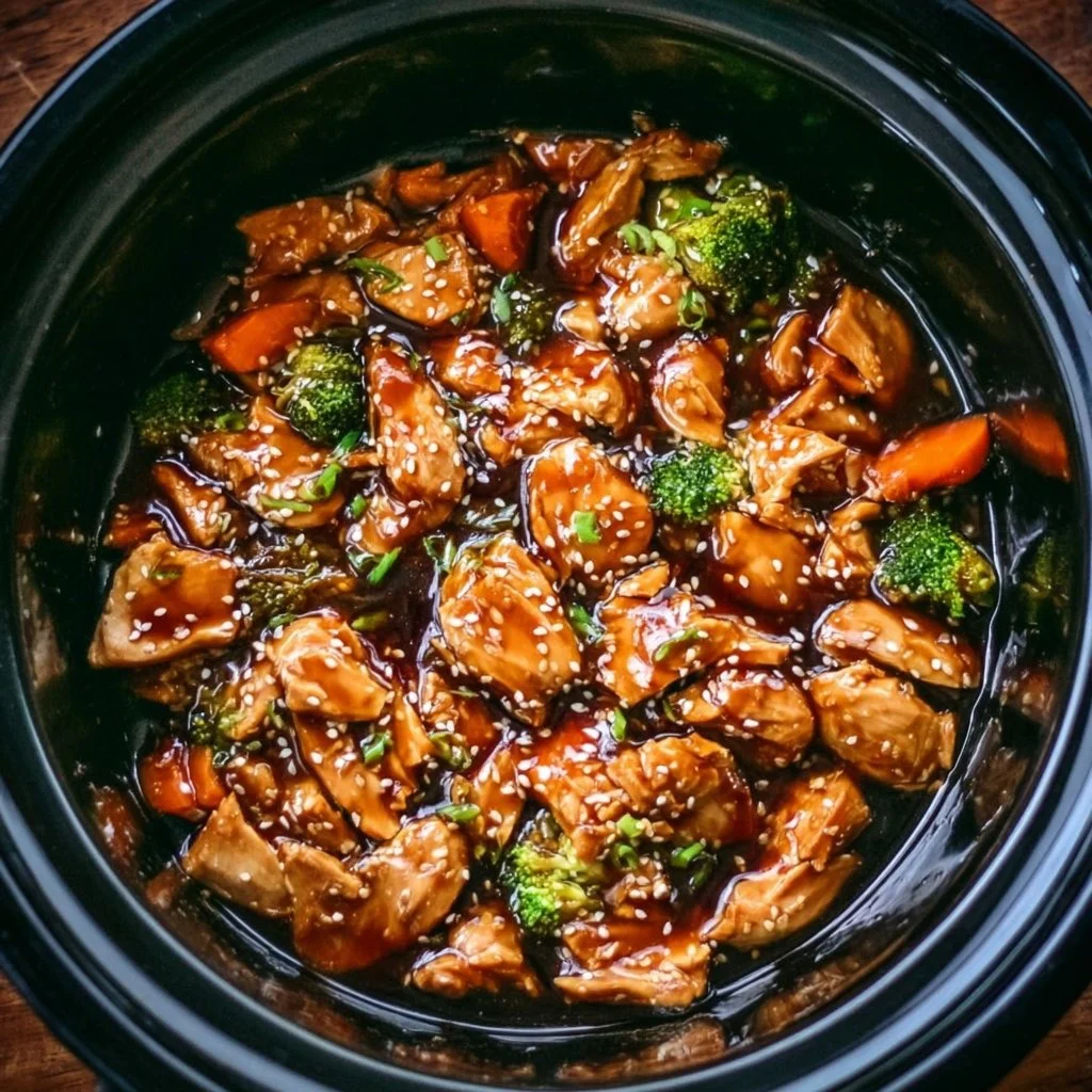 A deliciously simple dish that combines sweet, savory, and tangy flavors with tender chicken and vibrant vegetables, all cooked in a crockpot.